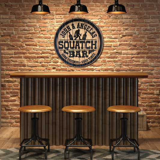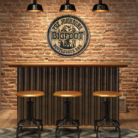 Personalized Squatch Bar Bigfoot Whiskey/Bourbon Barrel Lid Style Sign