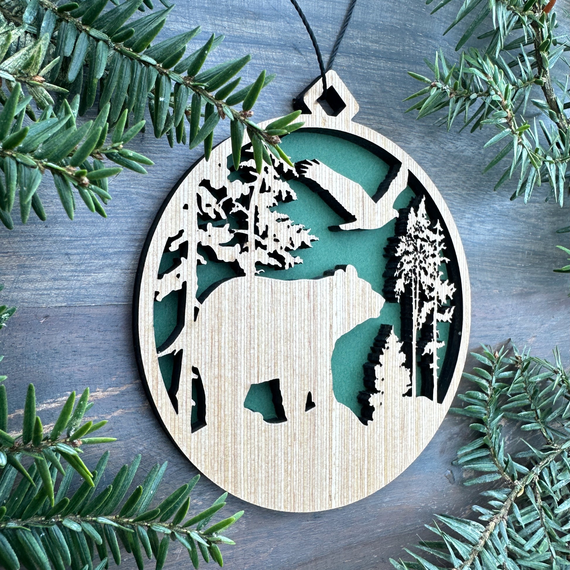 Make your Christmas or other holiday memorable with our laser cut wooden ornaments. Handcrafted with care from finished high quality 5mm wood with a colored 100# cardstock background. Black String Hanger included.