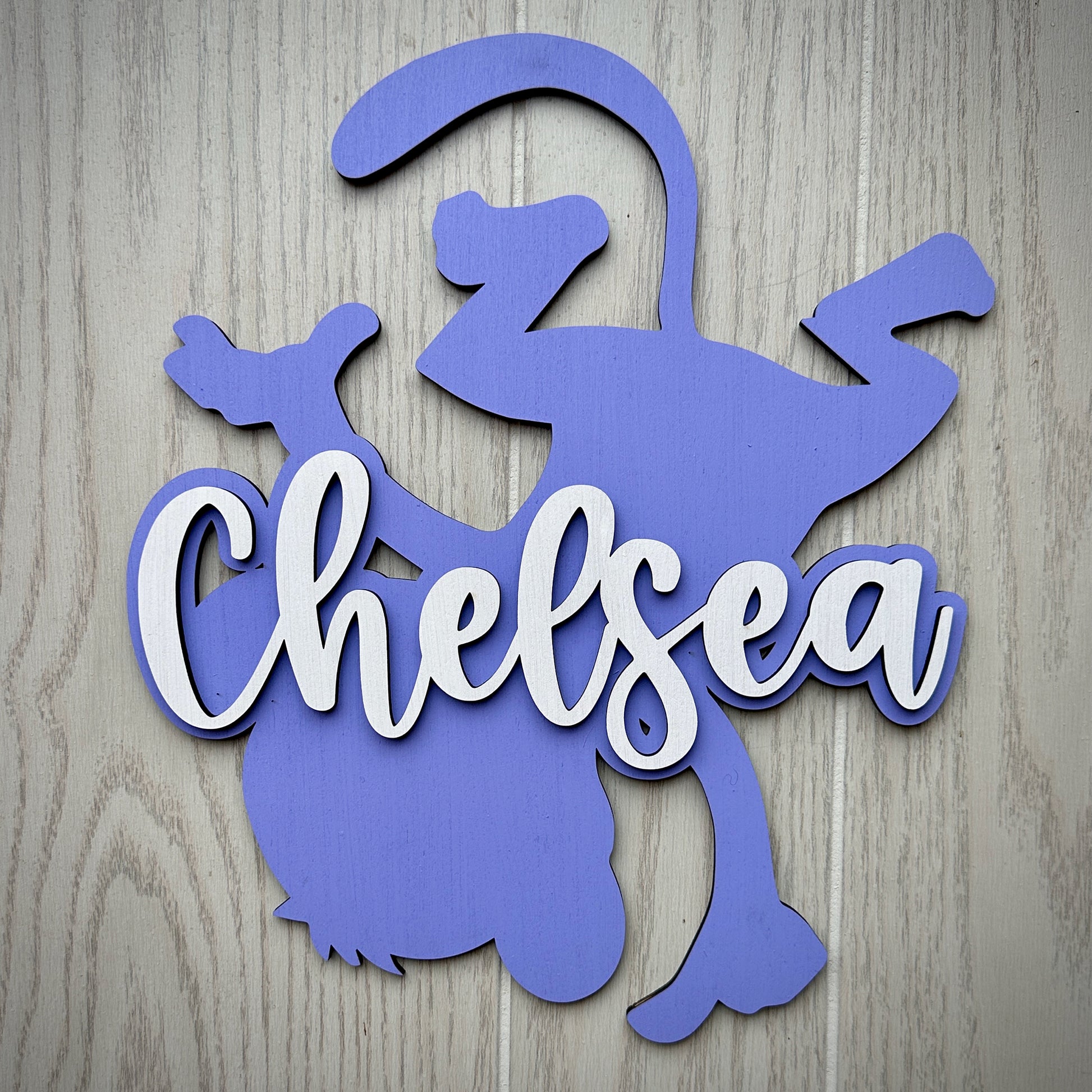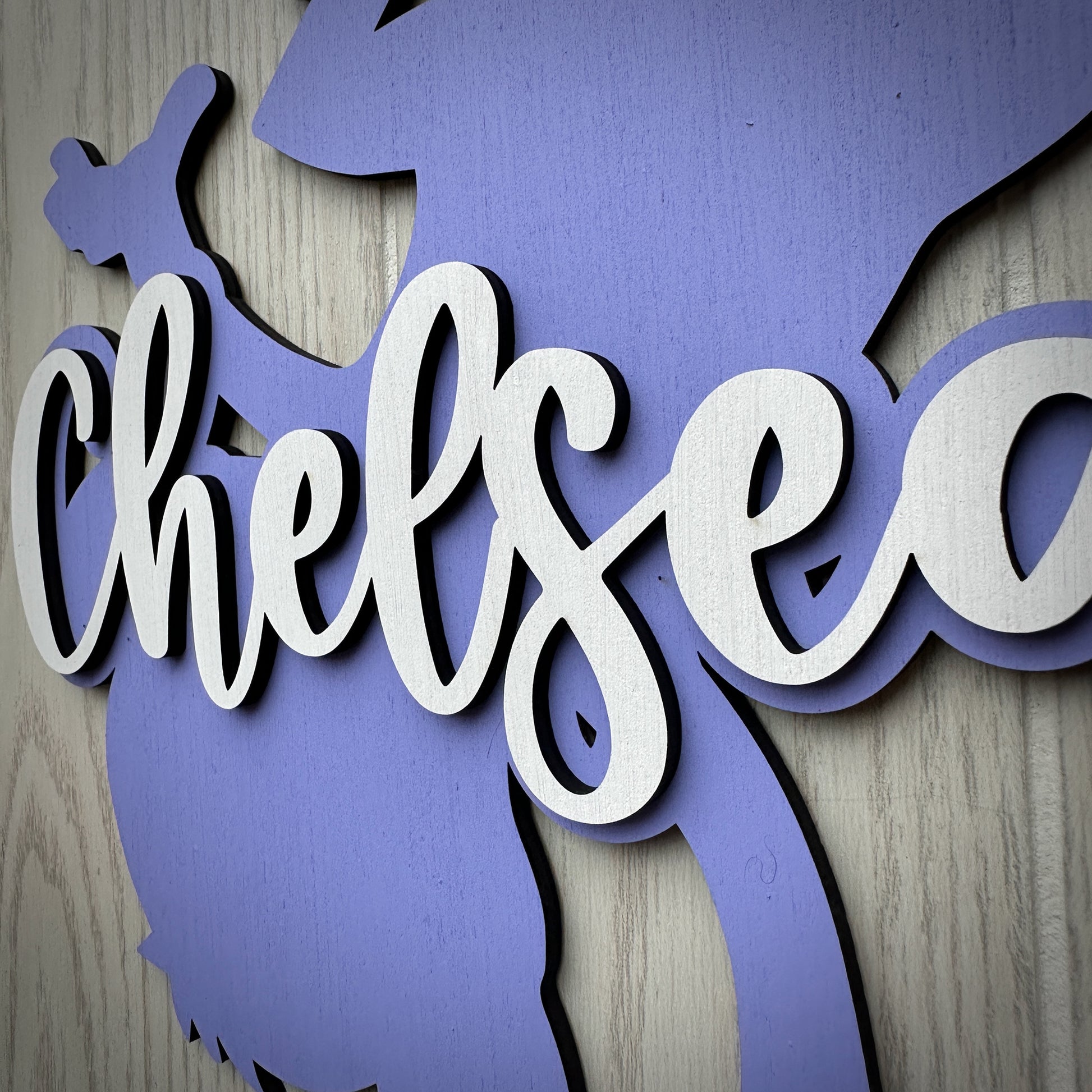 The wood letters are 5mm thick and painted to the color of your choice. The sides of the letters and backing will not be painted and will be dark. The letters are glued to 5mm plywood up to 18” sizes. For sizes over 18” the lettering is attached to ½” plywood.