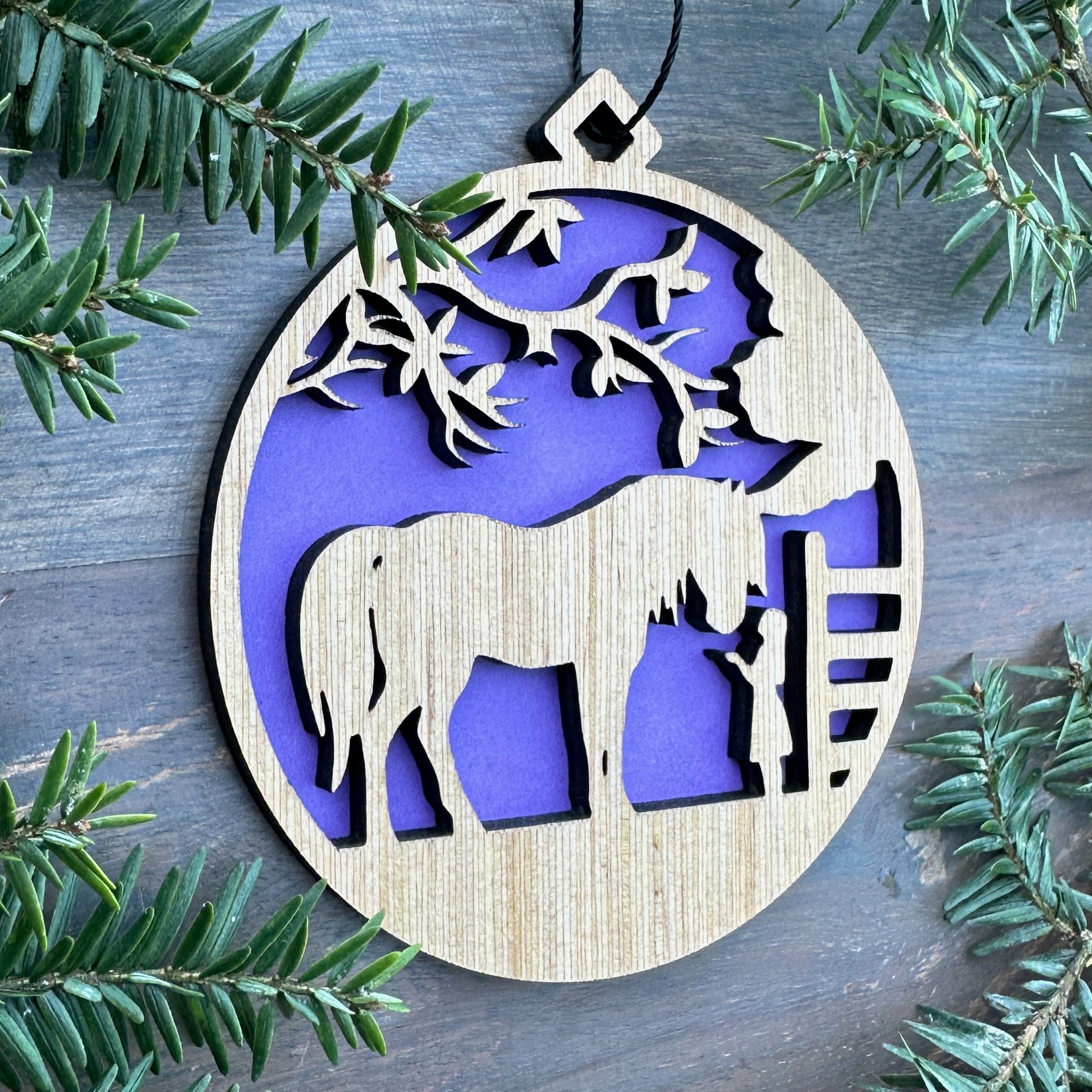 Make your Christmas or other holiday memorable with our laser cut wooden ornaments. Handcrafted with care from finished high quality 5mm wood with a colored 100# cardstock background. Black String Hanger included.