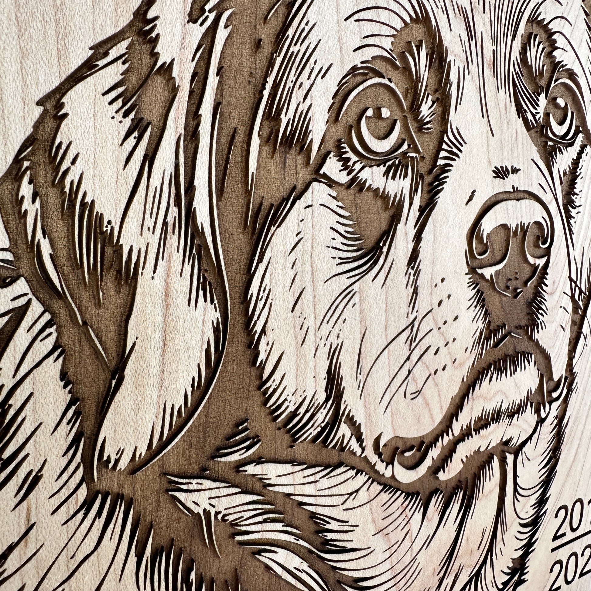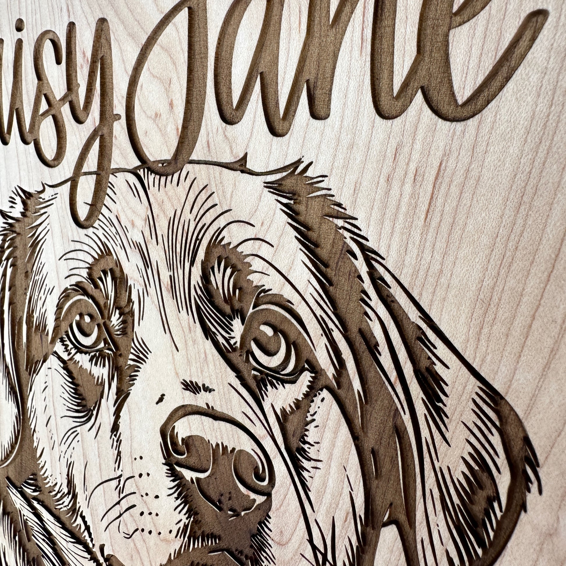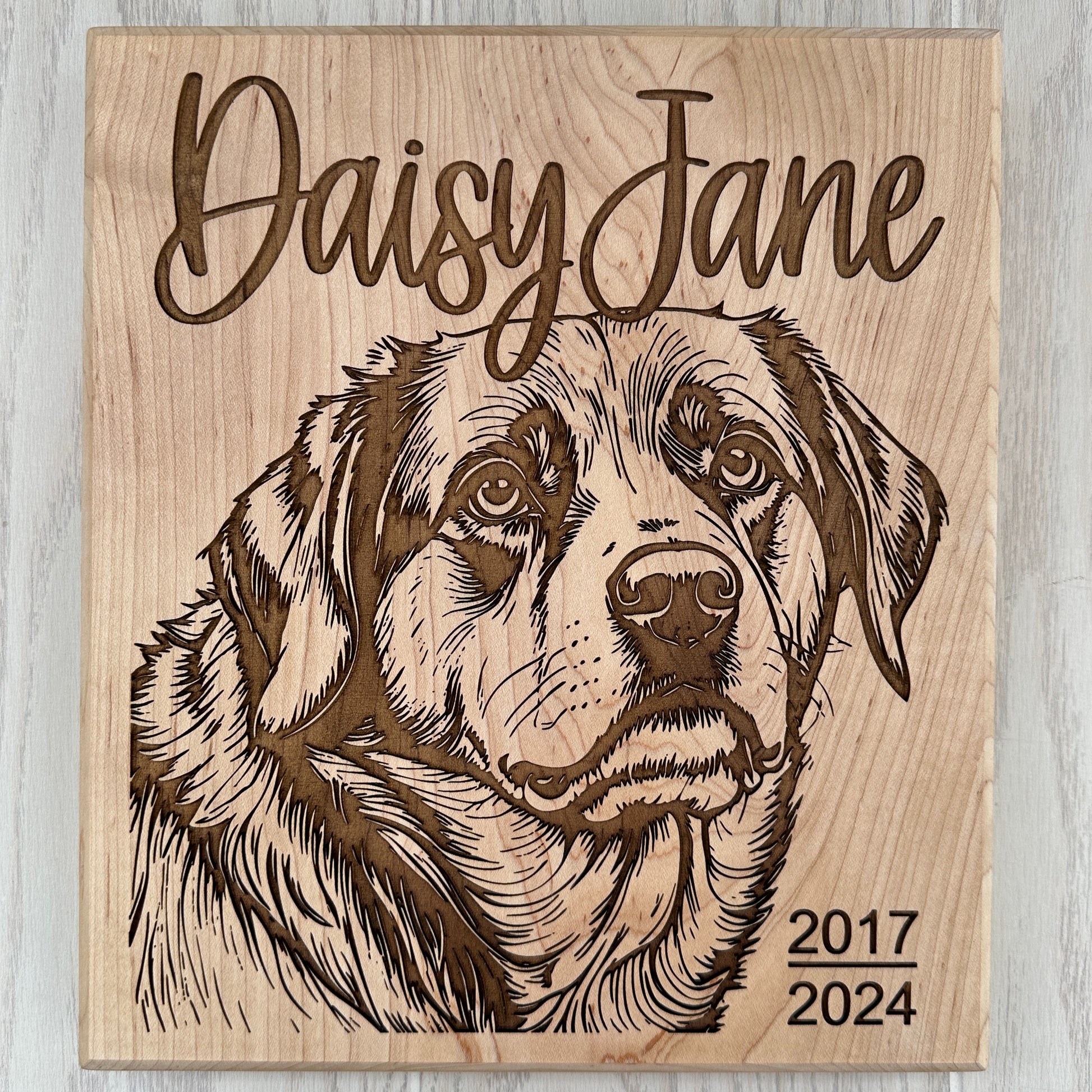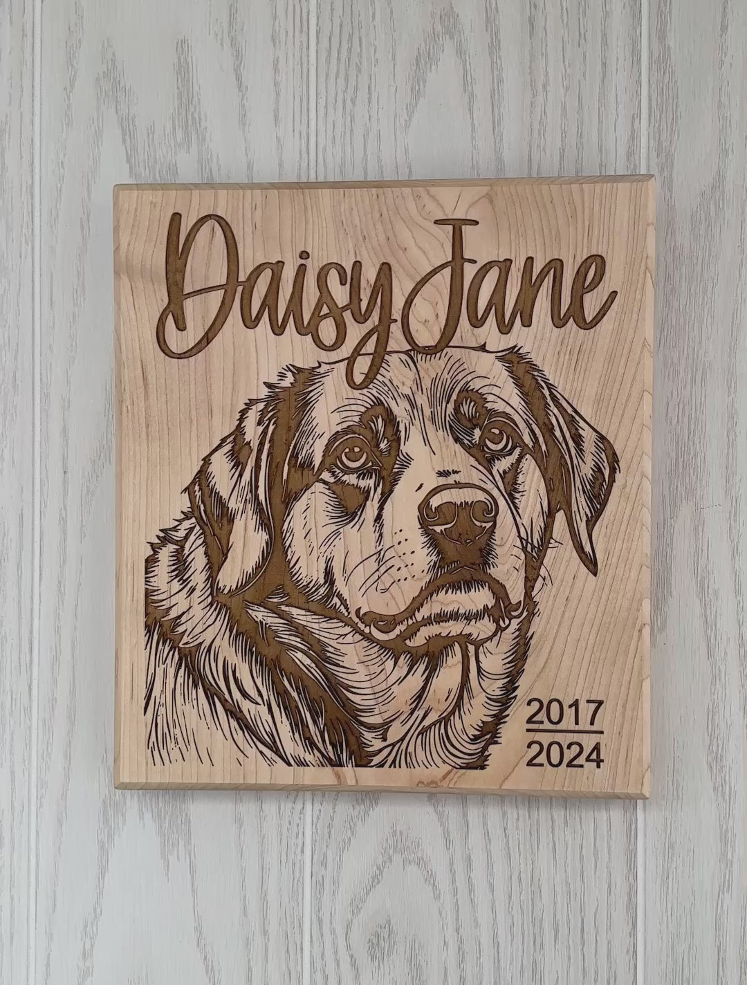 The photo provided is converted into black and white line art which is then combined with the wording that you provide. The design is then deep engraved into the wood and finished with a matte clear coat.